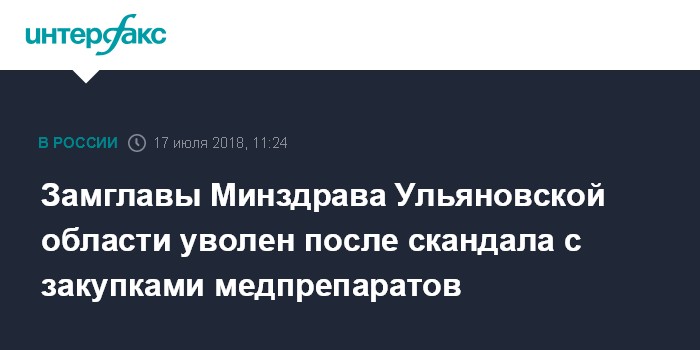 "По решению губернатора Сергея Морозова уволен заместитель министра здравоохранения Ульяновской области Андрей Алабин, курировавший госзакупки. Кадровое решение связано с недавним скандалом по закупкам медпрепаратов в больницы региона", - сообщил агентству "Интерфакс" пресс-секретарь главы региона Тимофей Гончарук во вторник. По его словам, это решение было озвучено накануне вечером на закрытом совещании Морозова с региональным правительством, где обсуждались меры по эффективной борьбе с коррупцией.
