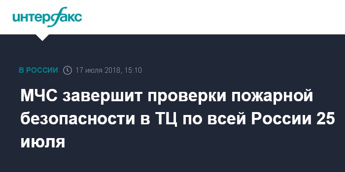 Москва. 17 июля. INTERFAX.RU - Проверка торговых центров, которую МЧС России проводило по всей стране после пожара в кемеровском ТРЦ "Зимняя вишня", завершится 25 июля, сообщил директор департамента надзорной деятельности МЧС Ринат Еникеев.
