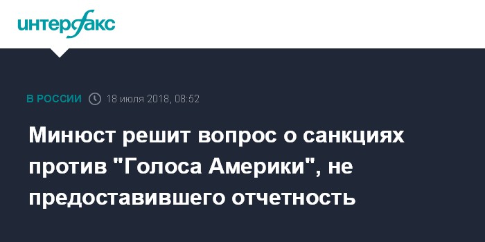 Москва. 18 июля. INTERFAX.RU - Минюст России рассмотрит вопрос о привлечении к ответственности признанной в РФ иностранным агентом радиостанции "Голос Америки" за непредоставление отчета, остальные восемь СМИ-иноагентов исполнили требование закона, сообщили "Интерфаксу" в пресс-службе министерства.