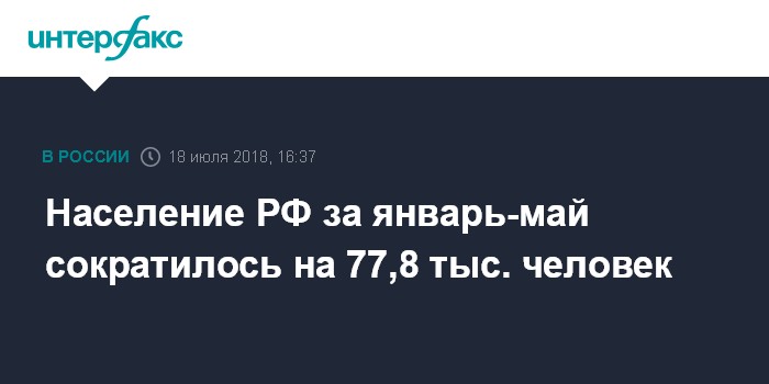 Москва. 18 июля. INTERFAX.RU - Население РФ за январь-май 2018 года сократилось на 77,8 тыс. человек, на 1 июня составляло 146,8 млн человек, сообщил в среду Росстат.