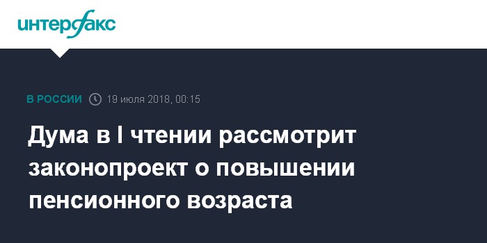 Москва. 19 июля. INTERFAX.RU - Госдума в четверг рассмотрит в первом чтении правительственный законопроект об изменениях в пенсионное законодательство, в том числе по повышению пенсионного возраста. Докладчиком от правительства РФ выступит министр труда и социальной защиты Максим Топилин.