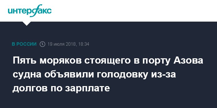 Москва. 19 июля. INTERFAX.RU - Российские моряки на судне "Риройл-5" под мальтийским флагом объявили голодовку в порту Азова, требуя погашения долгов по зарплате.
