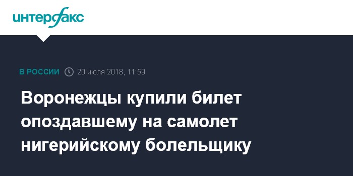 Москва. 20 июля. INTERFAX.RU - Сотрудники международного аэропорта "Воронеж" помогли болельщику сборной Нигерии, опоздавшему на свой рейс, сообщает пресс-служба аэропорта.