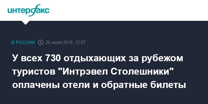 Москва. 20 июля. INTERFAX.RU - Более 730 туристов "Интрэвел Столешники" отдыхают за рубежом, у всех оплачены проживание и обратные билеты, так что вывозить никого не придется, сообщила в пятницу "Интерфаксу" пресс-секретарь Российского союза туриндустрии (РСТ) Ирина Тюрина.