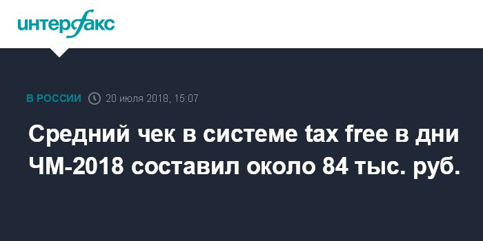 Москва. 20 июля. INTERFAX.RU - Средний чек в системе tax free в дни проведения в России Чемпионата мира по футболу - с 14 июня по 15 июля 2018 года - составил около 84 тысяч рублей, сообщает ФТС России.