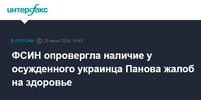 Москва. 20 июля. INTERFAX.RU - Управление Федеральной службы исполнения наказаний по республике Крым опровергло публикации СМИ об ухудшении состояния здоровья гражданина Украины Евгения Панова, приговоренного к восьми годам колонии строгого режима за подготовку диверсий на Крымском полуострове летом 2016 года.