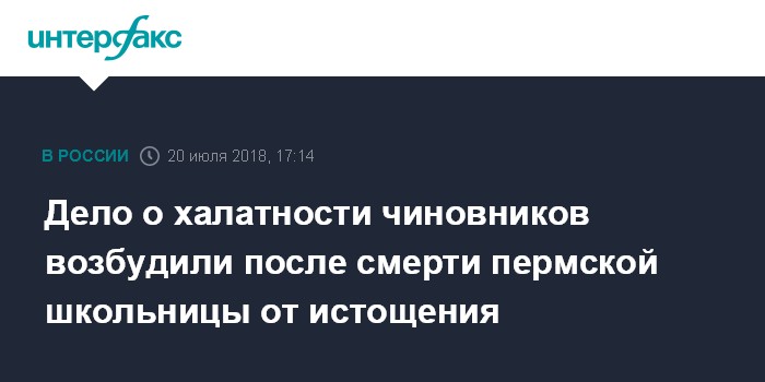 Москва. 20 июля. INTERFAX.RU - Следственные органы возбудили уголовное дело о халатности должностных лиц после смерти в городе Краснокамске Пермского края 14-летней девочки, которая, по некоторым данным, могла скончаться от истощения.