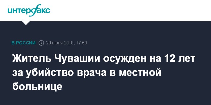 Москва. 20 июля. INTERFAX.RU - Судебная коллегия Верховного суда Чувашии утвердила приговор суда первой инстанции в отношении жителя Новочебоксарска за убийство врача-травматолога в местной больнице.
