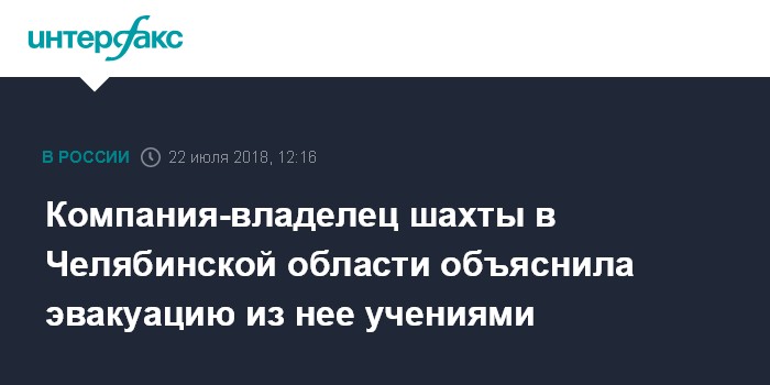 Москва. 22 июля. INTERFAX.RU - Эвакуация шахтеров из шахты "Центральная" в городе Пласт Челябинской области состоялась в рамках учений, возгорания в действительности не было, сообщили "Интерфаксу" в пресс-службе АО "Южуралзолото группа компаний" (ЮГК), которому принадлежит шахта.