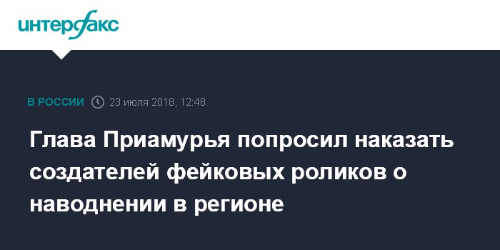 Москва. 23 июля. INTERFAX.RU - Врио губернатора Приамурья Василий Орлов на заседании правительственной комиссии по ЧС призвал правоохранительные органы привлечь к ответственности распространителей фэйковых роликов о паводках в регионе.