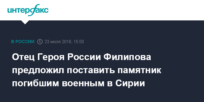 Москва. 23 июля. INTERFAX.RU - Отец российского летчика Романа Филипова, сбитого огнем боевиков во время приземления на парашюте над турецко-сирийской границе, предложил установить в Сирии обелиск в память о жертвах войны.