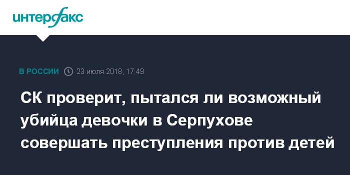 Москва. 23 июля. INTERFAX.RU - Подмосковные следователи проверят информацию СМИ о том, что подозреваемый в убийстве пятилетней девочки в Серпухове ранее пытался совершать преступления в отношении детей.