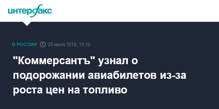 Москва. 25 июля. INTERFAX.RU - Рост цен на авиакеросин, который весной составил более 20%, привел к подорожанию цен на билеты, выяснил "Коммерсантъ".