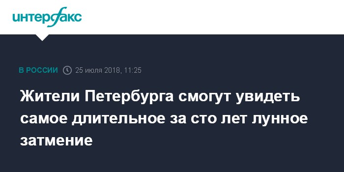 Москва. 25 июля. INTERFAX.RU - Самое длинное лунное затмение за последние сто лет смогут наблюдать жители северной столицы в ночь с 27 на 28 июля, сообщили "Интерфаксу" в Санкт-Петербургском планетарии в среду.