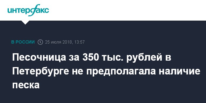 Москва. 25 июля. INTERFAX.RU - Детская песочница, смонтированная в центре Петербурга за 350 тысяч рублей, не предполагает наличие песка и закуплена по рыночным ценам, сообщила в среду пресс-служба администрации Центрального района северной столицы.