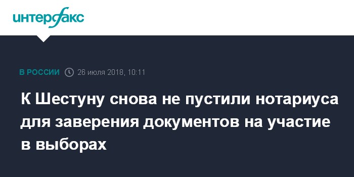 Москва. 26 июля. INTERFAX.RU - Нотариус вновь не смог пройти к арестованному главе Серпуховского района Подмосковья Александру Шестуну, который должен был заверить доверенность, позволяющую его супруге подать документы в избирком для участия в выборах на пост главы района на новый срок.