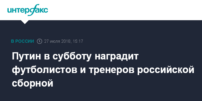 Москва. 27 июля. INTERFAX.RU - Президент РФ Владимир Путин в субботу, 28 июля вручит государственные награды и почетные грамоты 23 спортсменам и шести тренерам сборной команды России по футболу - участникам Чемпионата мира FIFA 2018, сообщает пресс-служба главы государства.
