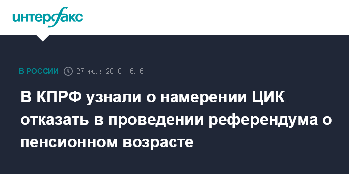 Москва. 27 июля. INTERFAX.RU - Центральная избирательная комиссия намерена отклонить просьбу КПРФ о проведении всероссийского референдума по вопросу о повышении пенсионного возраста, передает корреспондент "Интерфакса".