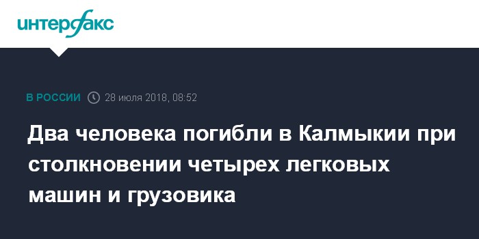 Москва. 28 июля. INTERFAX.RU - Двое погибли, четверо получили травмы в автомобильной аварии в Целинном районе Калмыкии, сообщается на сайте ГУ МЧС России по Калмыкии в субботу.
