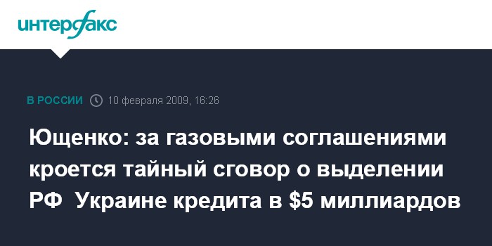 Ющенко: за газовыми соглашениями кроется тайный сговор о выделении РФ Украине кредита в $5 миллиардов