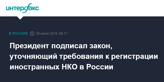 Москва. 30 июля. INTERFAX.RU - Президент России Владимир Путин подписал закон, который уточняет процедуру учета и регистрации в налоговых органах структурных подразделений международных организаций и иностранных некоммерческих организаций (НКО) в России. Документ опубликован в понедельник на официальном сайте правовой информации.