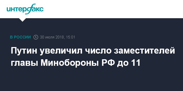 Москва. 30 июля. INTERFAX.RU - Президент РФ Владимир Путин разрешил увеличить число заместителей министра обороны до 11, включая двух первых заместителей.