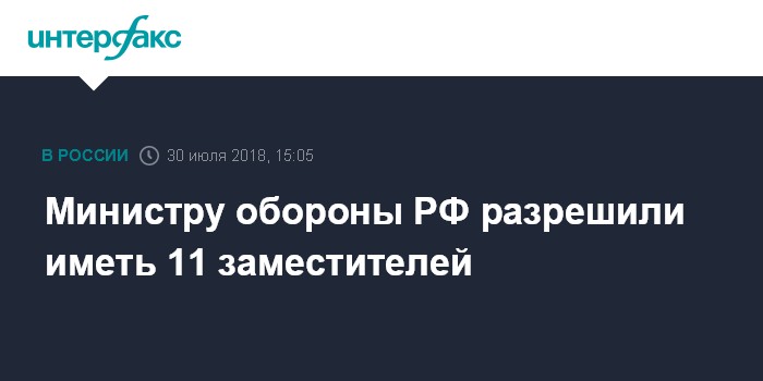 Москва. 30 июля. INTERFAX.RU - Президент РФ Владимир Путин разрешил иметь в Министерстве обороны 11 заместителей главы ведомства, в том числе двух первых заместителей министра. Соответствующий указ президента РФ опубликован на официальном интернет-портале правовой информации.