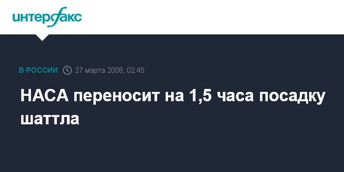 Москва. 27 марта. ИНТЕРФАКС - НАСА перенесло на 1,5 часа посадку американского шаттла "Эндевор" в связи с неблагоприятными погодными условиями над штатом Флорида, говорится в сообщении, размещенном на сайте НАСА.