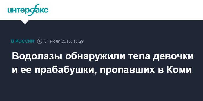 Москва. 31 июля. INTERFAX.RU - Спасатели подняли со дна реки Вычегды тела 15-летней девочки и ее прабабушки, пропавших в Усть-Вымском районе Коми несколько дней назад. Об этом сообщили "Интерфаксу" в пресс-службе регионального управления МЧС во вторник.