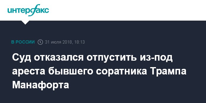 Москва. 31 июля. INTERFAX.RU - Апелляционный суд США во вторник отклонил прошение экс-главы предвыборного штаба Дональда Трампа Пола Манафорта об освобождении из-под стражи перед началом слушаний, сообщает во вторник Bloomberg.
