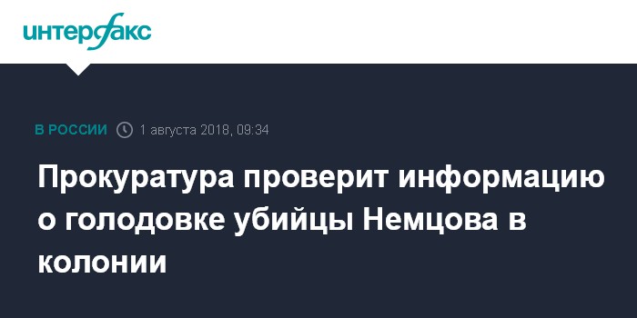Москва. 1 августа. INTERFAX.RU - Прокуратура проверяет информацию о голодовке Заура Дадаева, отбывающего наказание за убийство политика Бориса Немцова, которую распространил в СМИ адвокат осужденного, посетив его в иркутской колонии.