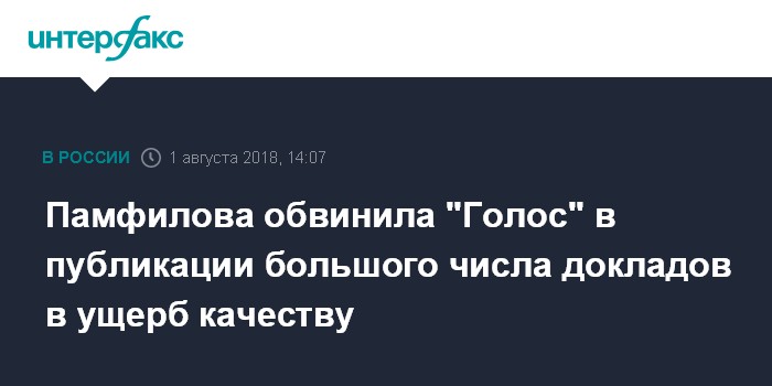 Москва. 1 августа. INTERFAX.RU - Глава Центризбиркома Элла Памфилова считает, что скорость работы движения "Голос" по публикации своих докладов наносит ущерб их качеству.