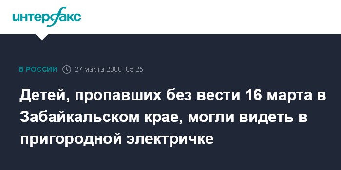 Чита. 27 марта. ИНТЕРФАКС-СИБИРЬ - Дети, пропавшие без вести 16 марта в поселке Карымское Забайкальского края, могли уехать на пригородной электричке в сторону Читы, сообщили в МВД.