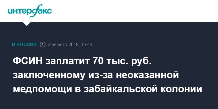 Москва. 2 августа. INTERFAX.RU - Суд в Чите обязал медучреждение ФСИН выплатить 70 тысяч рублей осужденному забайкальской колонии, которому не оказали должную медицинскую помощь.