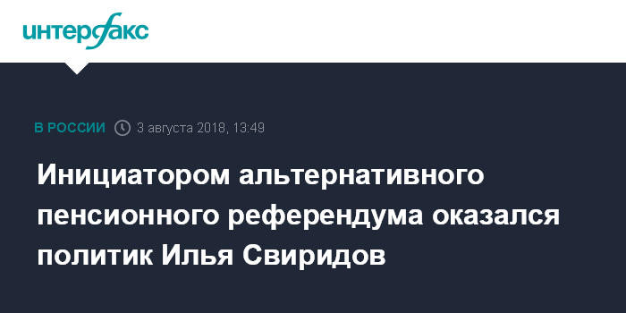 "Пенсионная реформа - главная угроза будущему России, оставаться в стороне от этой темы я не могу. Поэтому я принял решение создать инициативную группу по проведению общероссийского референдума по вопросу пенсионной реформы. В ближайшее время будут выполнены все необходимые по закону процедуры для регистрации инициативной группы и проверки вопроса референдума ЦИКом", - говорит Свиридов.