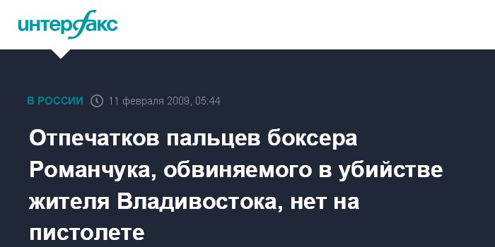 Владивосток. 11 февраля. ИНТЕРФАКС - ДАЛЬНИЙ ВОСТОК - Эксперты не нашли отпечатков пальцев боксера Романа Романчука на пистолете, из которого был застрелен житель Владивостока Олег Мешков.