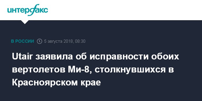 Москва. 5 августа. INTERFAX.RU - Вертолеты Ми-8, столкнувшиеся в Красноярском крае, перед вылетом находились в технически исправном состоянии, говорится в сообщении на сайте авиакомпании "ЮТэйр - Вертолетные услуги", которой принадлежал разбившийся борт.