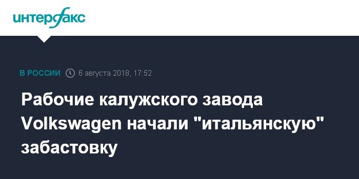 Москва. 6 августа. INTERFAX.RU - Сотрудники логистики сборочного производства ООО "Фольксваген Груп Рус" в Калуге начали с понедельника "итальянскую" забастовку, сообщает профсоюз "МПРА-Калуга" в своей официальной группе в соцсетях.