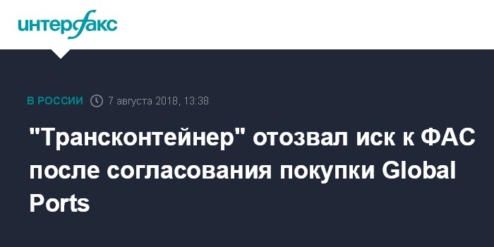 Москва. 7 августа. INTERFAX.RU - ПАО "Трансконтейнер" отозвал иск к Федеральной антимонопольной службе (ФАС) РФ, в октябре 2017 года отказавшей оператору в покупке терминала группы Global Ports (ЗАО "Логистика-Терминал", Санкт-Петербург), сообщил корреспондент "Интерфакса" из зала суда.
