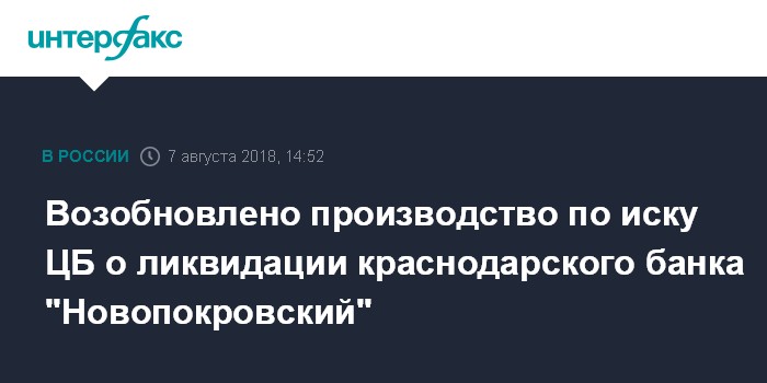 Москва. 7 августа. INTERFAX.RU - Арбитражный суд Краснодарского края возобновил производство по иску ЦБ РФ о принудительной ликвидации банка "Новопокровский" (Краснодар), сообщается в материалах суда.