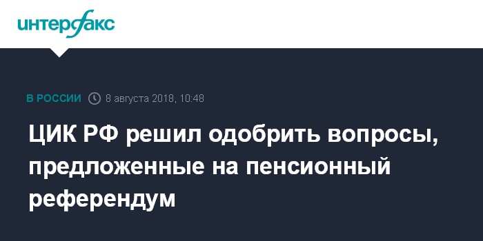 Москва. 8 августа. INTERFAX.RU - Центризбирком намерен признать соответствующими законодательству вопросы, предложенные тремя инициативными группами для вынесения на всероссийский референдум о повышении пенсионного возраста.
