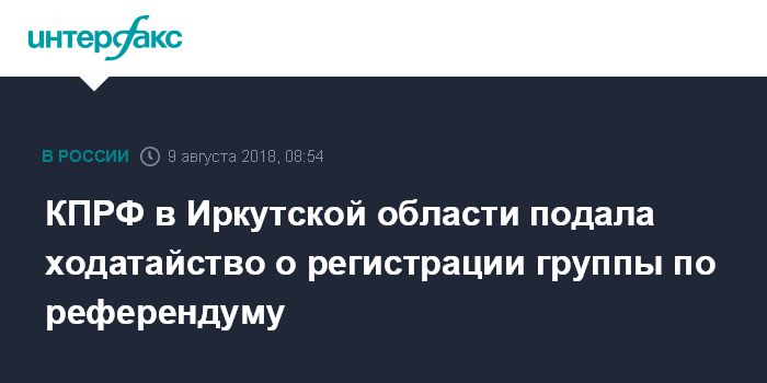 Москва. 9 августа. INTERFAX.RU - Областной комитет КПРФ подал в Избирательную комиссию Иркутской области ходатайство о регистрации региональной подгруппы инициативной группы КПРФ по проведению референдума об изменении пенсионного возраста. Об этом сообщили агентству "Интерфакс" в пресс-службе избиркома в четверг.