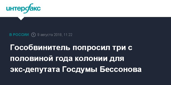 "Как у представителя стороны обвинения у меня нет сомнений, что господин Бессонов причастен к преступлению, в совершении которого он обвиняется. Его вина доказана полностью. Обвинение просит суд признать бывшего депутата Госдумы Бессонова виновным и назначить ему наказание сроком на три с половиной года лишения свободы в исправительной колонии общего режима", - сказал гособвинитель.