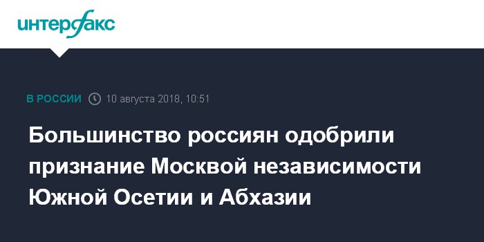 Москва. 10 августа. INTERFAX.RU - Большинство (80%) россиян считают правильным принятое десять лет назад Москвой решение о признании Южной Осетии и Абхазии, почти треть считают нормальным нынешнее состояние российско-грузинских отношений, свидетельствуют данные опроса ВЦИОМ, поступившие в пятницу в "Интерфакс".