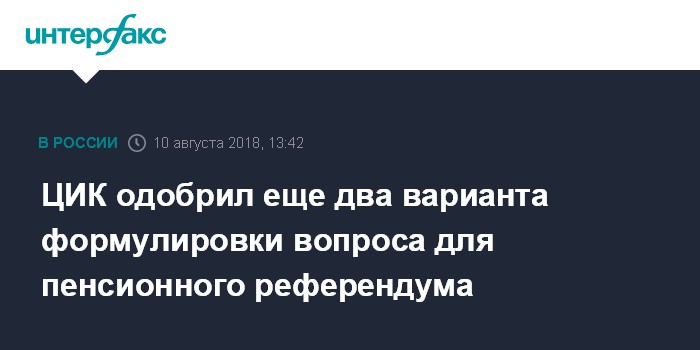 8 августа ЦИК РФ признал вопросы, предложенные тремя другими инициативными группами, для вынесения на всероссийский референдум о повышении пенсионного возраста, соответствующими законодательству.