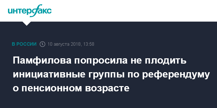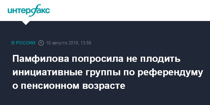Москва. 10 августа. INTERFAX.RU - Глава Центральной избирательной комиссии (ЦИК) РФ Элла Памфилова попросила не плодить многочисленные инициативные группы по референдуму о повышении пенсионного возраста, так как это уменьшает шансы на его проведение.