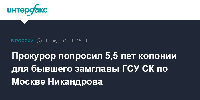 Москва. 10 августа. INTERFAX.RU - Гособвинение попросило приговорить к пяти с половиной годам колонии строгого режима бывшего первого замруководителя столичного главка Следственного комитета России, генерала Дениса Никандрова, обвиняемого в коррупции.