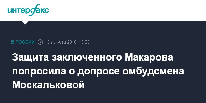 Москва. 10 августа. INTERFAX.RU - Защита избитого в ярославской колонии Евгения Макарова обратилась к следователю с ходатайством о допросе уполномоченного по правам человека в РФ Татьяны Москальковой в качестве свидетеля по делу.