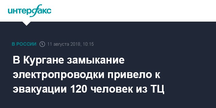Москва. 11 августа. INTERFAX.RU - Замыкание электропроводки произошло утром в субботу в торгово-развлекательном центре "Стрекоза" в Кургане, сообщает пресс-служба Главного управления (ГУ) МЧС России по региону.