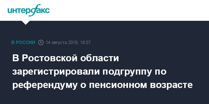 Москва. 14 августа. INTERFAX.RU - Избирательная комиссия Ростовской области зарегистрировала подгруппу по выдвижению инициативы проведения референдума, касающегося повышения пенсионного возраста, сообщает пресс-служба регионального избиркома во вторник.